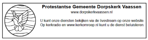 De kopij voor de zondagsbrief moet op vrijdag vóór 16.00 uur binnen zijn. De kopij kan per e-mail worden gestuurd naar zondagsbrief@dorpskerkvaassen.nl. De redacteuren wisselen elkaar maandelijks af. Het actuele redactielid staat met adres en telefoonnummer op de zondagsbrieven.
